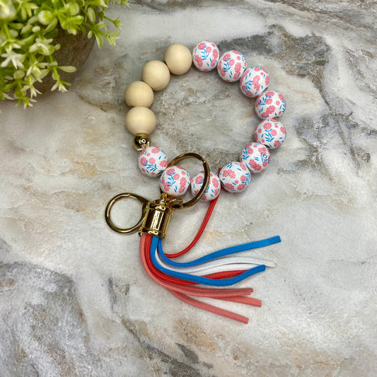 Wood Bracelet with Tassel Keychain - Coral Blue Floral