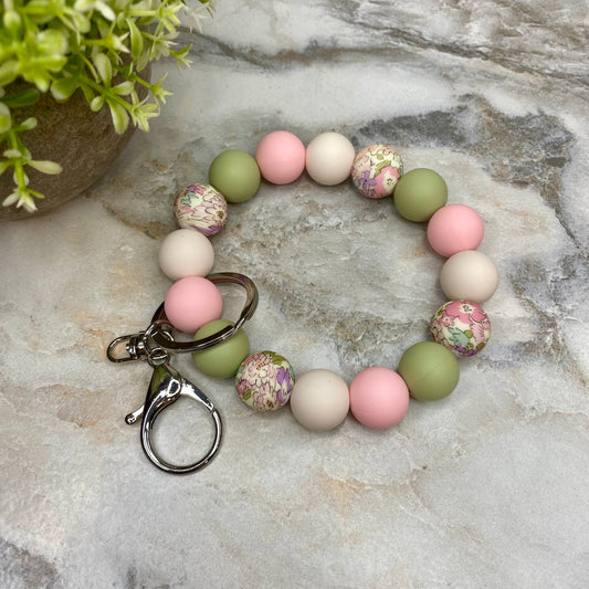 Silicone Bracelet Keychain - Light Green Pink Floral