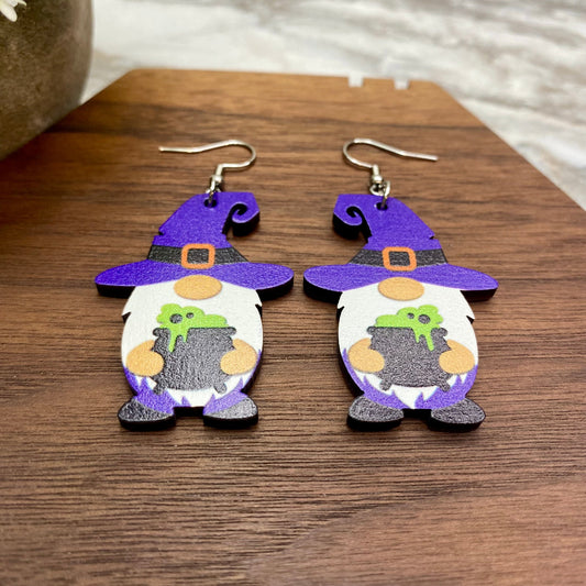 Wooden Dangle Earrings - Halloween - Gnome Cauldron