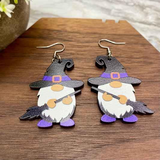 Wooden Dangle Earrings - Halloween - Gnome Witch