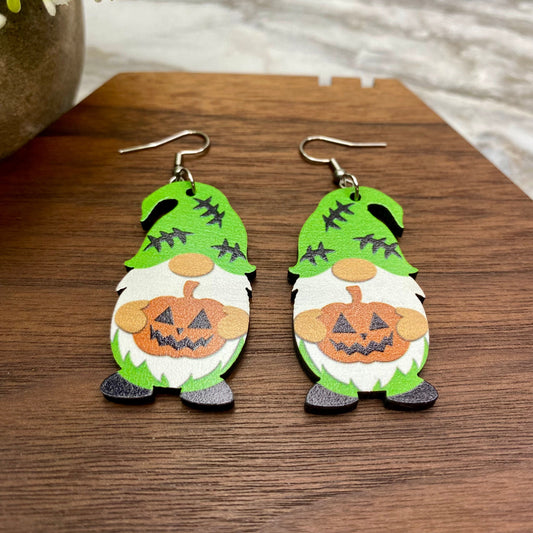Wooden Dangle Earrings - Halloween - Gnome Frankenstein Pumpkin