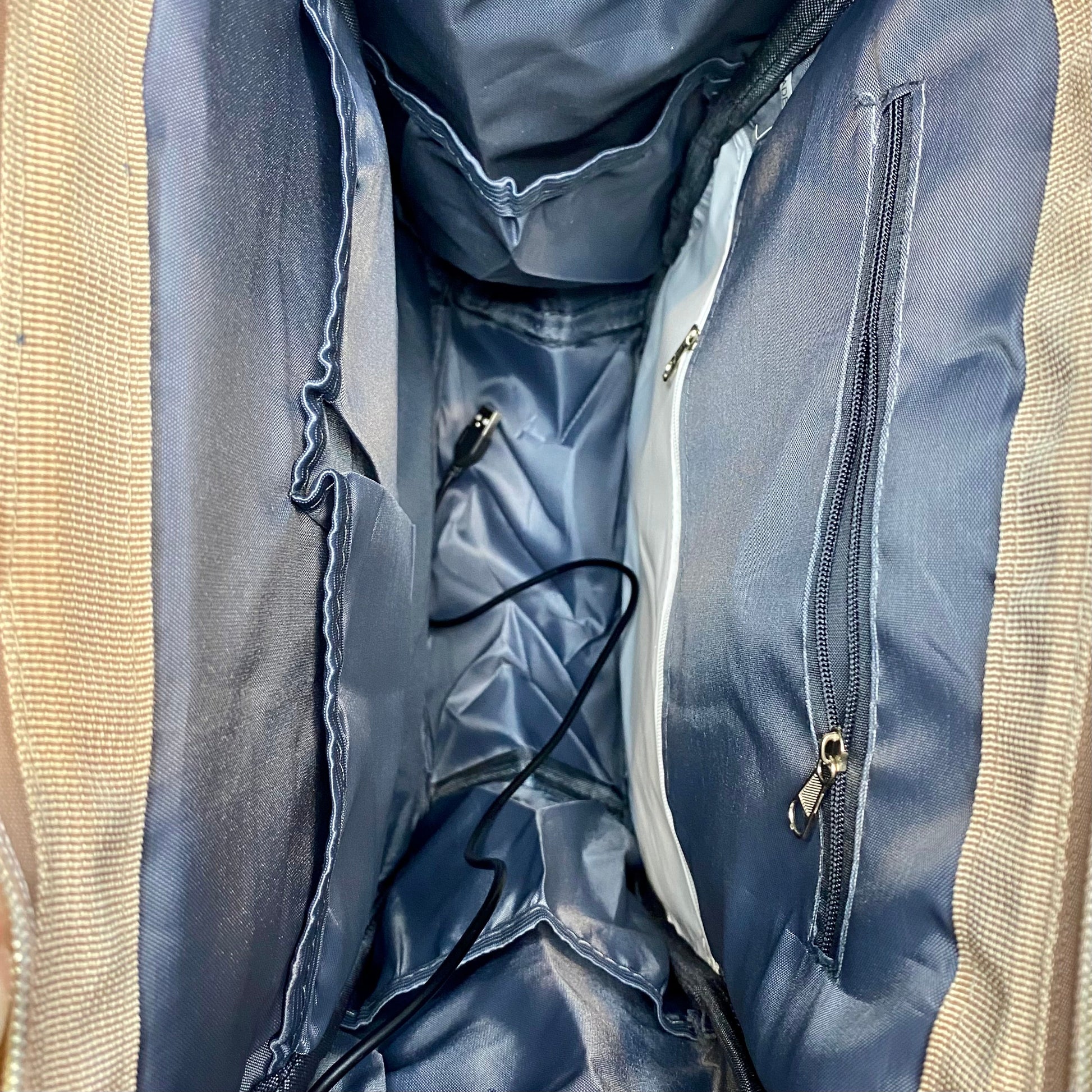 Built in usb a cord inside to usb a on the outside of the bag.