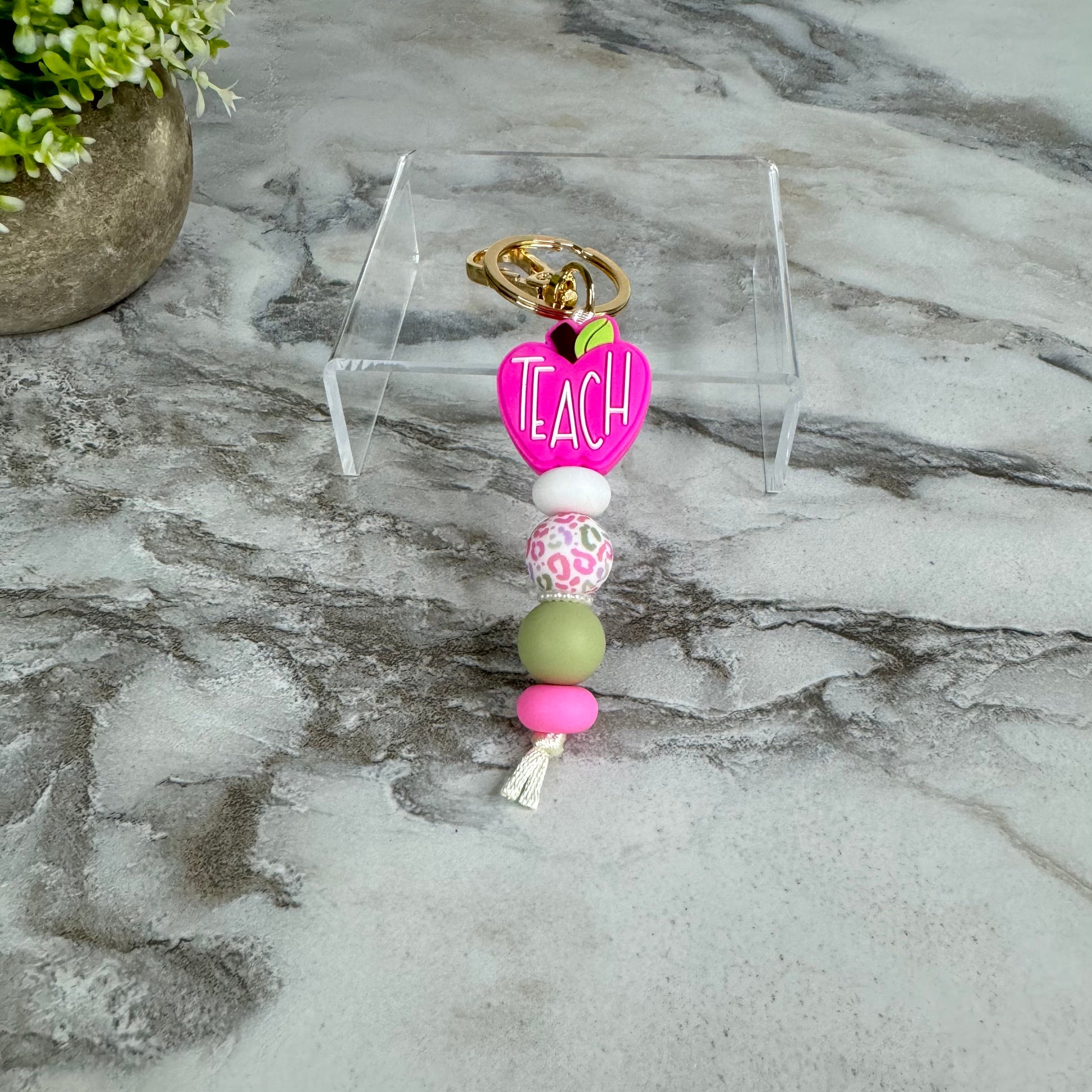 Keychain - Silicone Bead - Teach, Pink Leopard