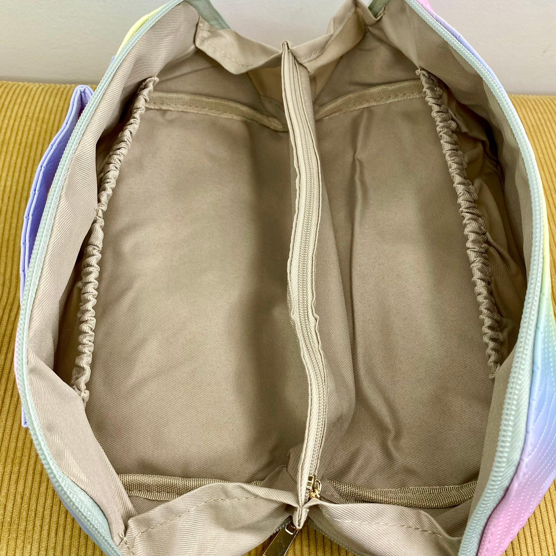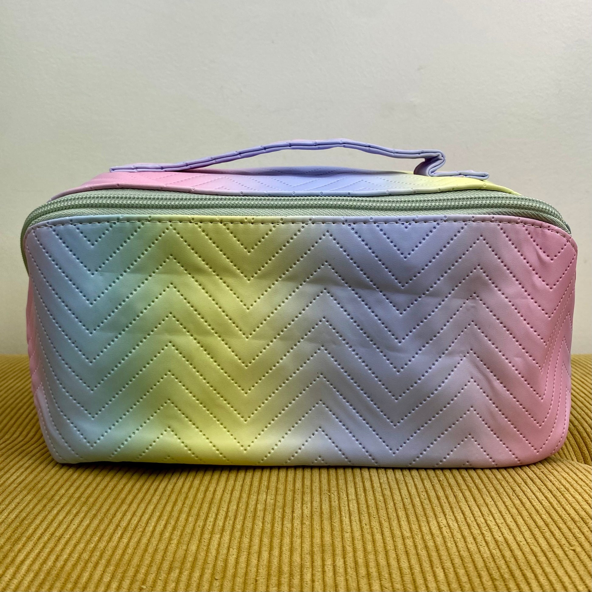 These gorgeous cosmetic bags are a rectangle shape with a diagonal zipper that allows it to open completely flat so it is easy to see & grab all the essentials.