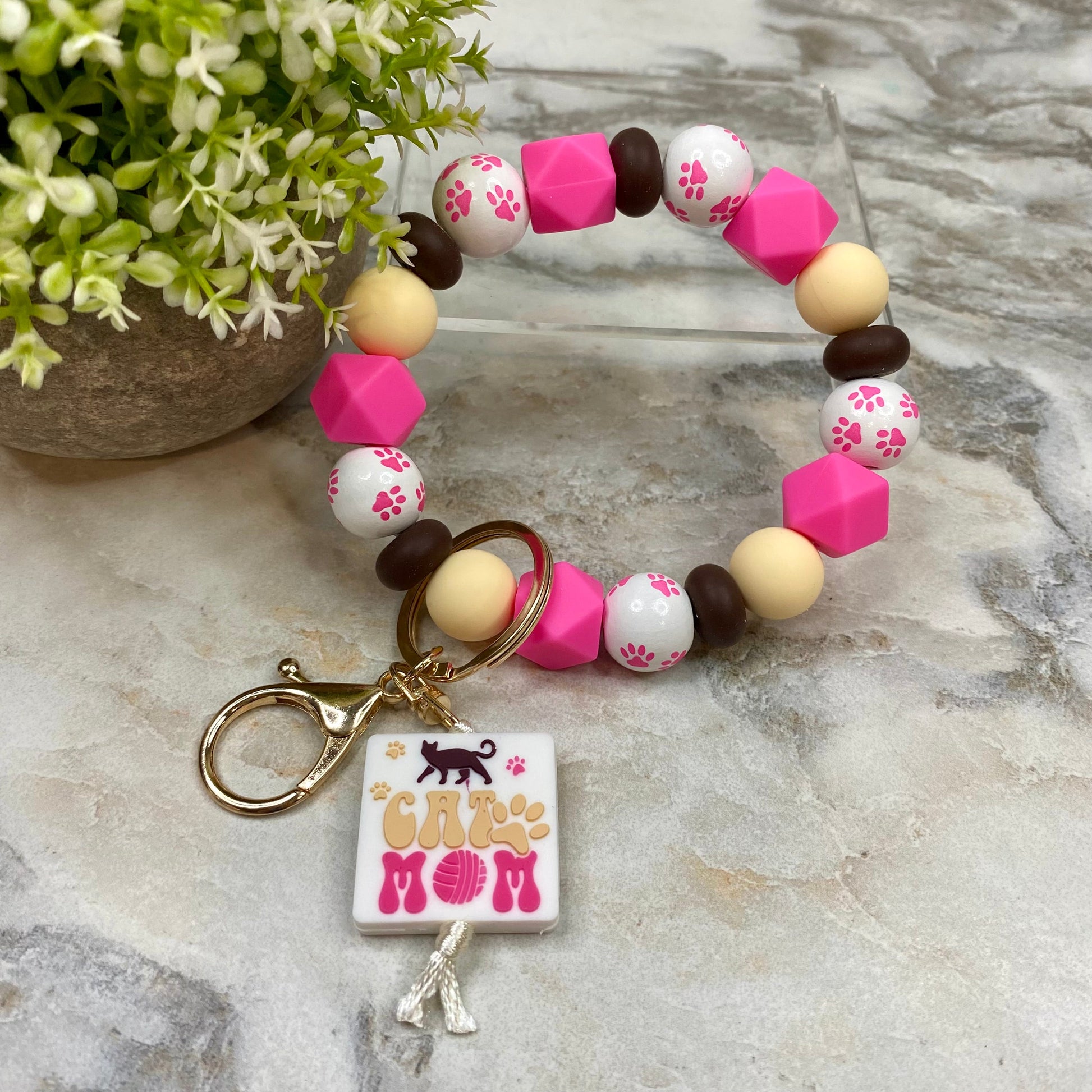 Wood & Silicone Bracelet Keychain - Cat Mom Pink Cream
